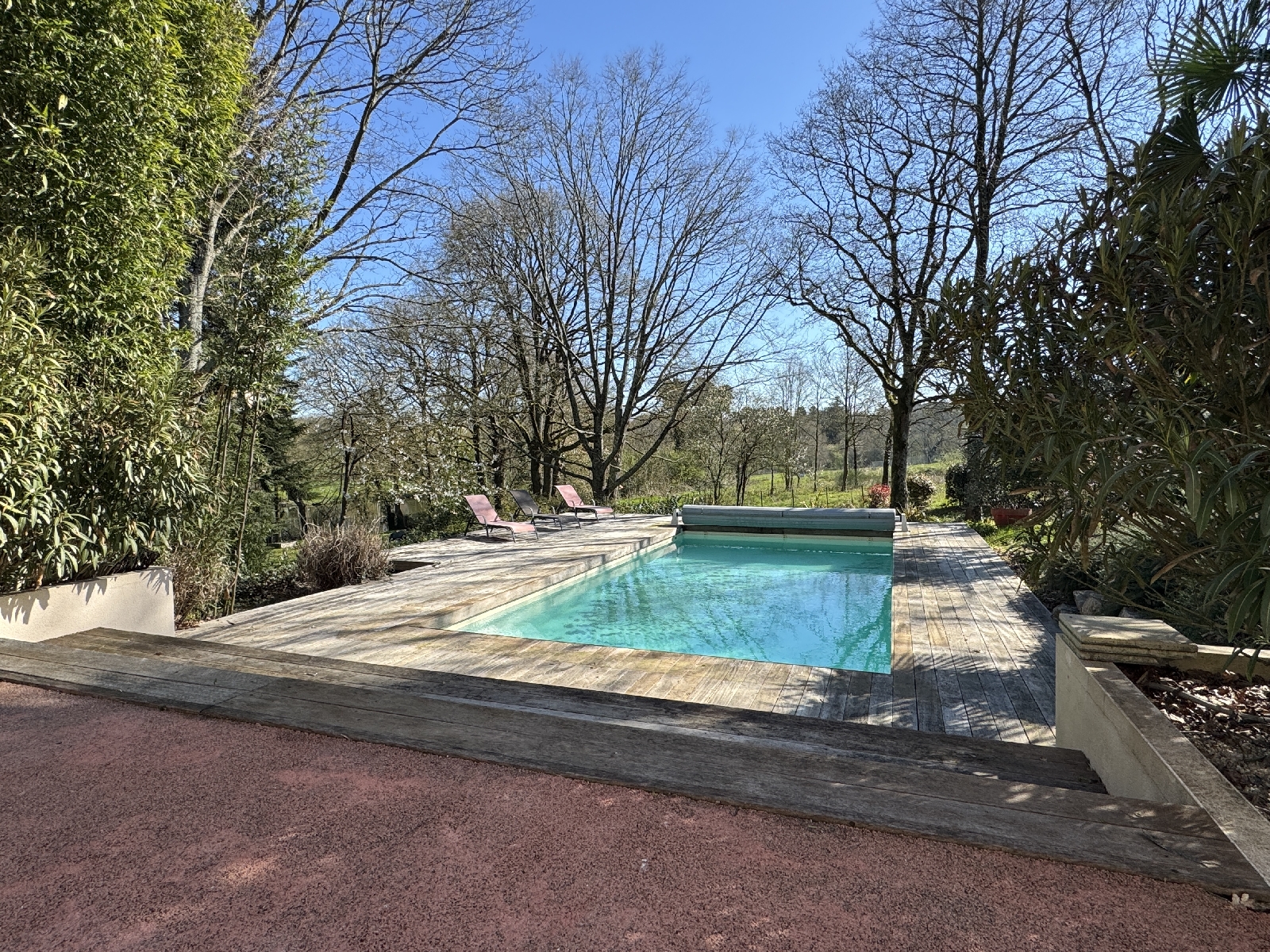 Coté Parc et Jardin de très beaux espaces pour la détente comme la piscine, les différentes terrasses et les espaces paysager, un espace de prairie arborée qui sétend jusquà la rivière, la propriété compte 40 m de berges, un univers extraordinaire.
